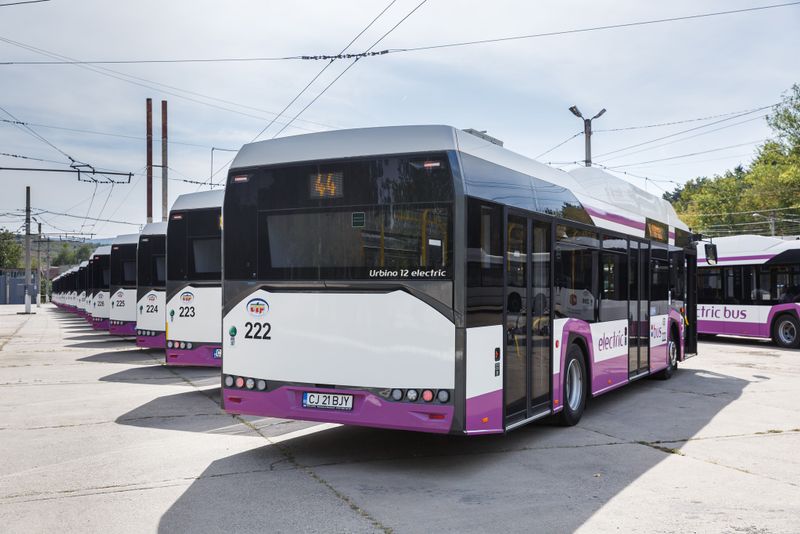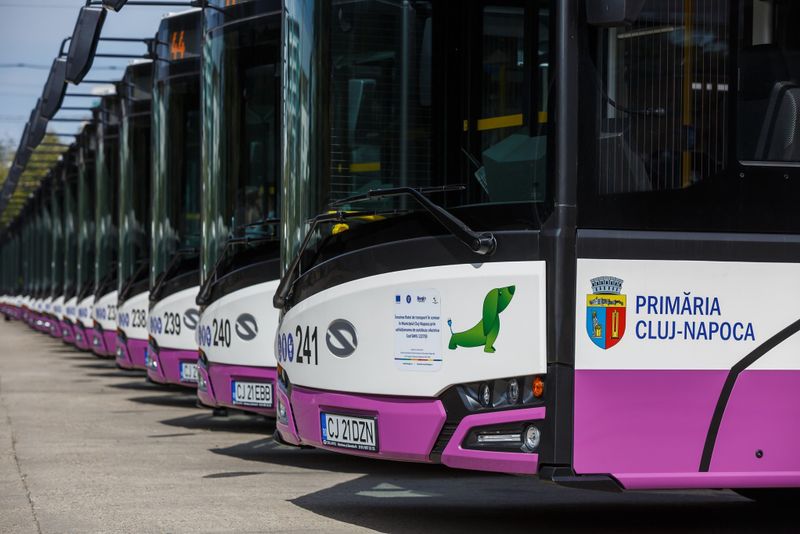 Astfel, în acest moment, transportul public din Cluj are în dotare 41 de autobuze electrice, dintre care 11 achiziționate prin fonduri elvețiene și 30 prin fonduri europene.În prezent municipiul Cluj-Napoca are cea mai mare flotă de autobuze electrice din România și se află în primele 10 orașe din Uniunea Europeană cu autobuze electrice raportate la numărul de locuitori.Mijloacele de transport electrice care au intrat astăzi în circulație sunt ultimele din cele 30 care au fost achiziționate cu finanțare europeană, prin Programul Regional Operațional 2014 - 2020, în cadrul proiectului „Înnoirea flotei de transport în comun în Municipiul Cluj-Napoca prin achiziţionarea de autobuze electrice”.Primăria Cluj-Napoca și Compania de Transport Public Cluj-Napoca continuă susținerea transportului public din oraș prin implementarea proiectelor care vizează modernizarea flotei de transport public - achiziționarea de noi mijloace de transport nepoluante: 50 de troleibuze și 24 de tramvaie.Prin implementarea politicilor de prioritizare și modernizare a transportului public urmărim să oferim respect clujenilor, să creștem calitatea vieții la Cluj și să promovăm un transport public nepoluant care să conducă la un stil de viață sănătos bazat pe utlizarea mijloacelor alternative la mașină.Autobuzele care intră de astăzi pe rutele Companiei de Transport Public Cluj-Napoca sunt modern dotate cu echipamente ce au caracteristici de ultimă generație:Informații generale: - prețul unui autobuz este de 2.374.725 lei/ buc + TVA - autobuzele corespund tuturor normelor Europene în domeniu - garanția este de 5 ani sau 500.000 kmCaracteristici tehnice: - capacitatea totală de transport este de 78 călători dintre care: 27 locuri pe scaune și 51 locuri în picioare - autonomie de 105 km pentru baterii noi - capacitate baterii 200kwh tip Solaris High Energy - puterea motorului electric este de 160 kW (218 CP ) - lungimea autobuzului este de 12 m - podea complet coborâtă - rampă pentru fotoliile rulante ale persoanelor cu dizabilități - loc special amenajat în salon pentru fotoliile rulante și landourile pentru copii - înclinarea pe o parte a autobuzului în stații - 3 uşi duble ( cu câte 2 foi fiecare), cu sistem antistrivire a călătorilor - internet gratuit WI-FI pentru călători - sistem de încălzire în sezonul rece - sistem de aer condiționat pentru sezonul cald - sistem de iluminare interioară a salonului cu lămpi de tip LED - afișaje de traseu exterioare cu LED-uri - indicator vizual interior de stații cu LED-uri - monitor tip LCD în interior - anunțarea vocală a stațiilor în salon - sistem de supraveghere video în interior și exterior - sistem de numărare a călătorilor transportați - computer de bord pentru gestiune și management al traficului ( CGMT) - datele din computerul de bord al autovehiculului se descarcă într-un server care gestionează baza de date și generează rapoarte specifice cu privire la: numărul de km parcurși, consumurile de energie, numărul de pasageri transportați, etc..Pentru încărcarea celor 20 autobuze electrice care au fost introduse astăzi în circulație vor fi folosite 20 de stații de încărcare lentă și 4 stații de încărcare rapidă.