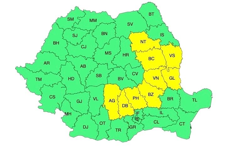 Administrația Națională de Meteorologie a emis atenționări cod portocaliu de caniculă, dar și cod galben de instabilitate atmosferică accentuată.