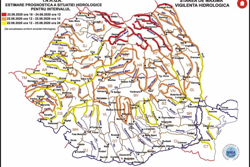 În intervalul menționat, pe râurile din bazinele hidrografice: Tisa - sector aval intrarea ȋn ţară, Vişeu, Iza (judeţul Maramureş), Someşul Mare - bazin superior şi afluenţi bazin mijlociu şi inferior (judeţul Bistriţa Năsăud), Suceava (judeţul Suceava), Moldova (judeţele: Suceava şi Neamţ), Bistriţa - bazin amonte Ac. Izvorul Muntelui şi afluenţii aferenţi sectorului aval Ac. Izvorul Muntelui (judeţele: Suceava, Neamţ, Harghita şi Bacău), Prut – sector amonte Ac. Stânca Costeşti (judeţul Botoşani). Fenomenele hidrologice periculoase, vizate de Avertizarea Hidrologică COD ROȘU, se pot produce cu probabilitate mai mare pe unele râuri din județele Suceava, Neamț și Botoșani, ȋn intervalul 23.06.2020 ora 09:00 – 23.06.2020 ora 24:00. Hidrologii menționează că fenomenele hidrologice periculoase se pot produce şi pe afluenții de grad inferior ai râurilor marcate pe hartă.