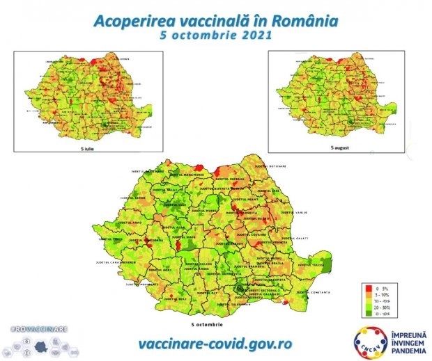 Comuna Dumbrăvița, din județul Timiș, este localitatea cu cea mai mare rată de vaccinare din România, luni, 11 octombrie, cu un procent de 54,5%.