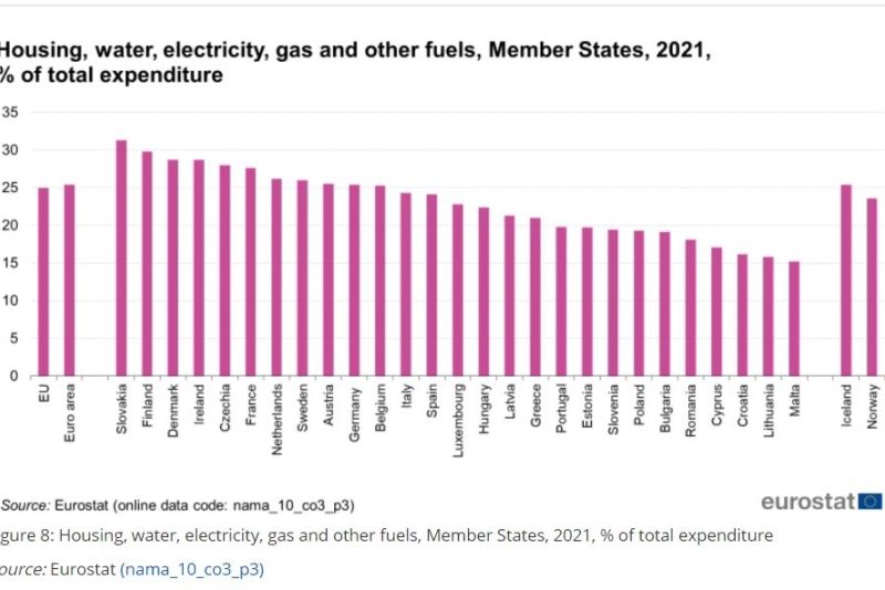 În 2021, cheltuielile pentru “locuințe, apă, electricitate, gaz și alți combustibili” reprezentau un sfert (25,0%) din cheltuielile gospodăriilor din UE, în scădere cu 0,5 puncte procentuale (pp) față de 2020, arată datele publicate de Eurostat. ‘Alimentele și băuturile nealcoolice’ (-0,5 pp) au scăzut, de asemenea, în rândul categoriilor de cheltuieli ale gospodăriilor, reprezentând 14,3% din cheltuielile totale în 2021. În ceea ce privește cheltuielile pentru “Alimente și băuturi nealcoolice”, cele mai mari ponderi au fost înregistrate în România (25,2%).