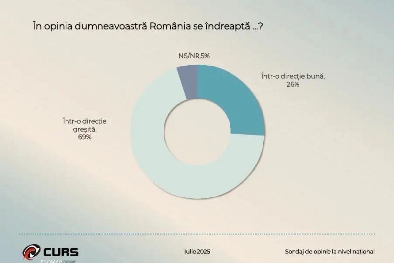 O altă întrebre pusă în cadrul sondajului a fost aceea cu privire la direcția în care se îndreaptă România. Răspunsurile au fost în majoritate covârșitoare: 69% dintre respondenți au spus că țara se îndreaptă într-o direcșie greșită. Doar 26% au spus că România se îndreaptă într-o direcție bună, iar 5% au ales opțiunile nu știu/nu răspund.