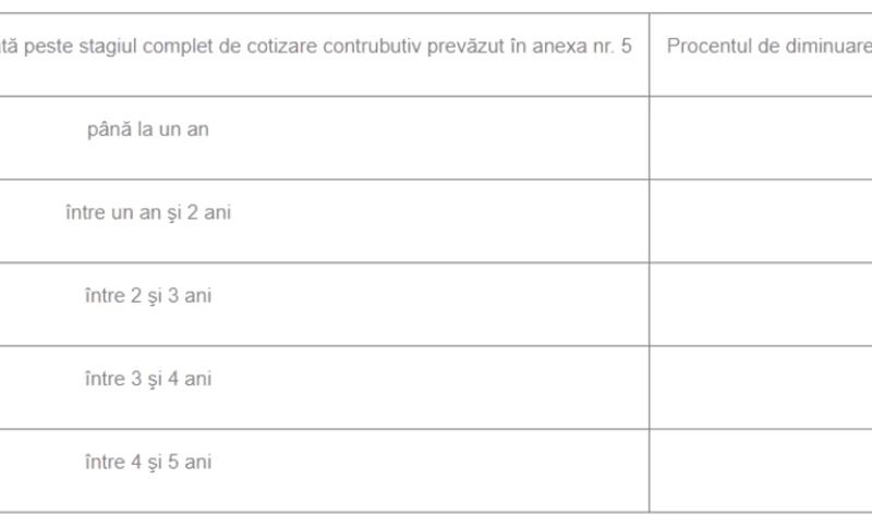 Cuantumul pensiei anticipate se stabileşte prin diminuarea cuantumului pensiei pentru limită de vârstă, în raport cu stagiul de cotizare realizat peste stagiul complet de cotizare contributiv prevăzut în anexa nr. 5 şi cu numărul de luni cu care s-a redus vârsta standard de pensionare, conform tabelului următor: