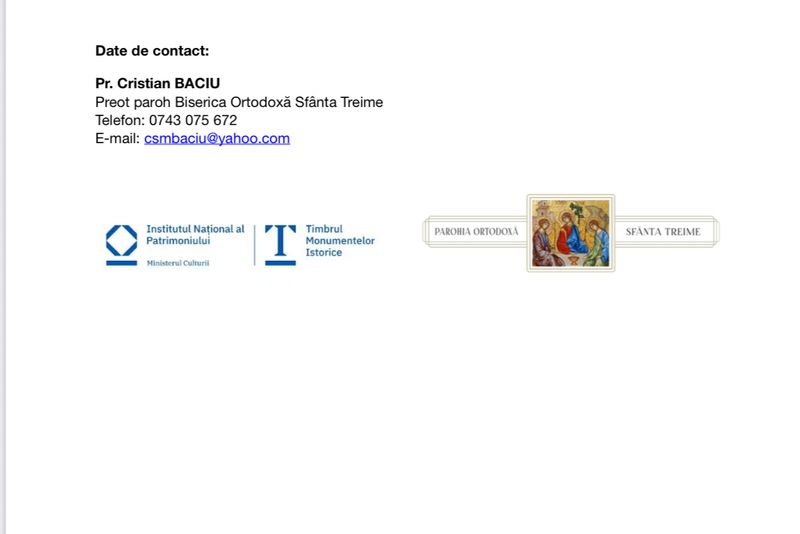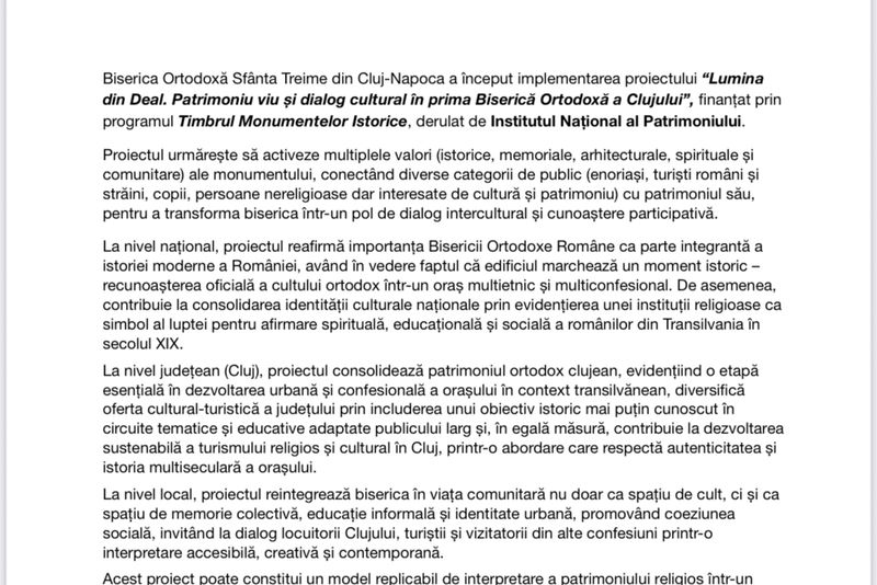 Patrimoniu viu și dialog cultural în prima Biserică Ortodoxă a Clujului”, finanțat prin programul Timbrul Monumentelor Istorice, derulat de Institutul Național al Patrimoniului.