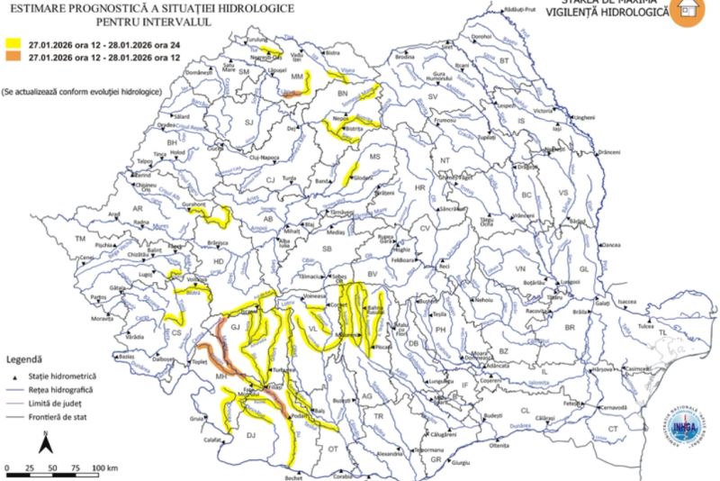 Astfel, Codul portocaliu este valabil în intervalul 27 ianuarie, ora 12:00 – 28 ianuarie, ora 12:00 şi vizează râuri din judeţele: Maramureş, Gorj, Mehedinţi şi Dolj.